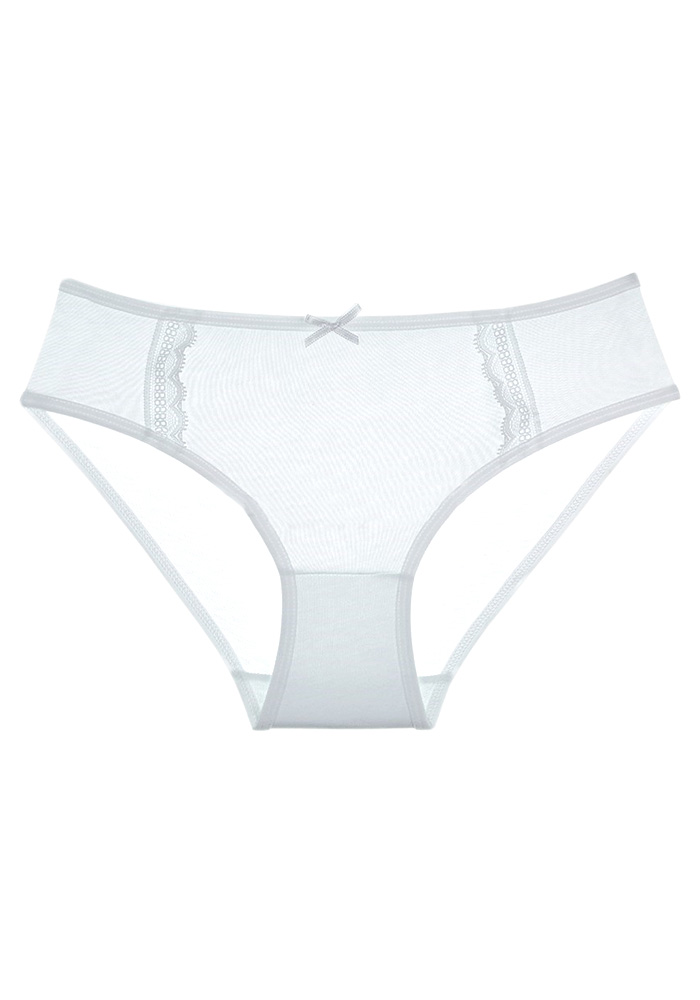 Детские трусы белого цвета, по бокам украшены кружевной полоской, на поясе - бантик.