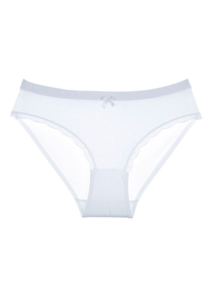 Детские трусы для девочки из однотонного полотна. Пояс выполнен из широкой резинки, украшен бантиком. Пройма декорированы кружевом.