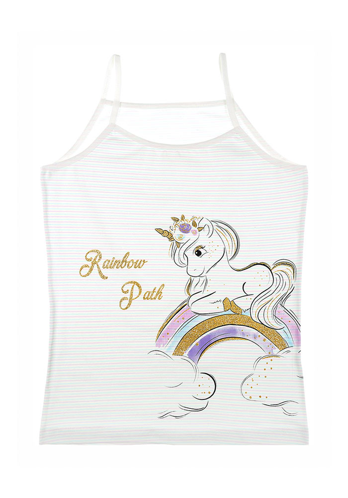 Детская майка для девочки на тонких бретелях. Спереди украшен рисунком.