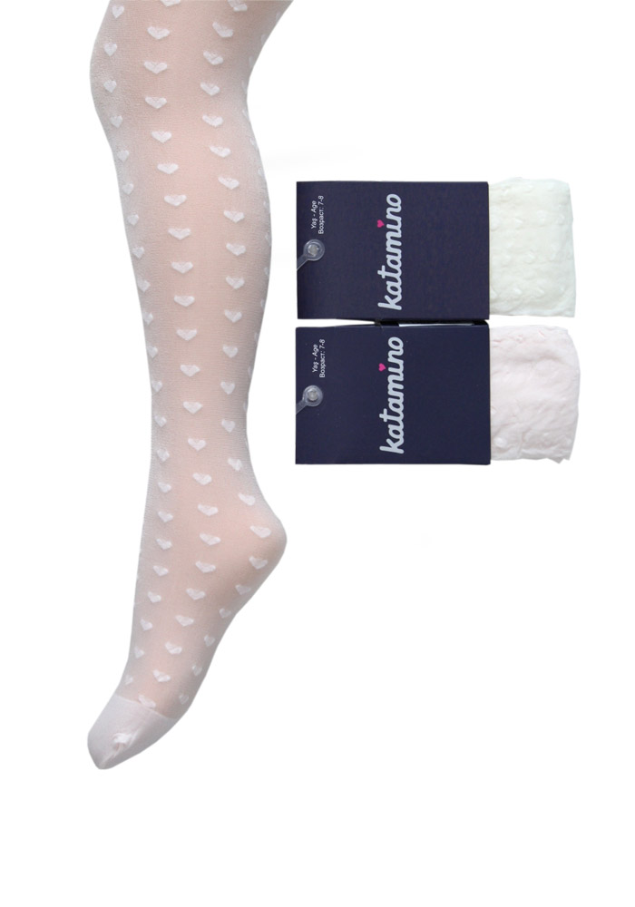 Капроновые колготки, украшенные узором из сердечек. Материал прочный и эластичный. Пальчики модели дополнительно уплотнены. Модель имеет высокую посадку, плоские удобные швы.