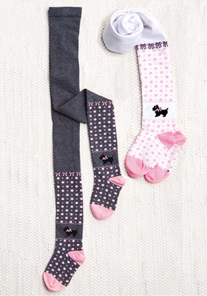 Детские гладкие колготки с пяткой и рисунком в виде скотчтерьера и горошков.