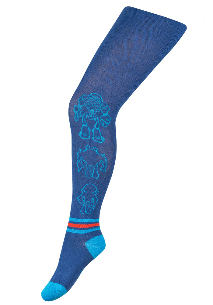 Колготки для мальчиков украшены интересным рисунком в виде роботов и красно-синих полосок на уровне щиколотки. Изготовлены из качественного хлопка, а эластичность и износостойкость ему придают полиамидные нити и эластан. Колготки плотно облегают детские ножки и их легко надевать.