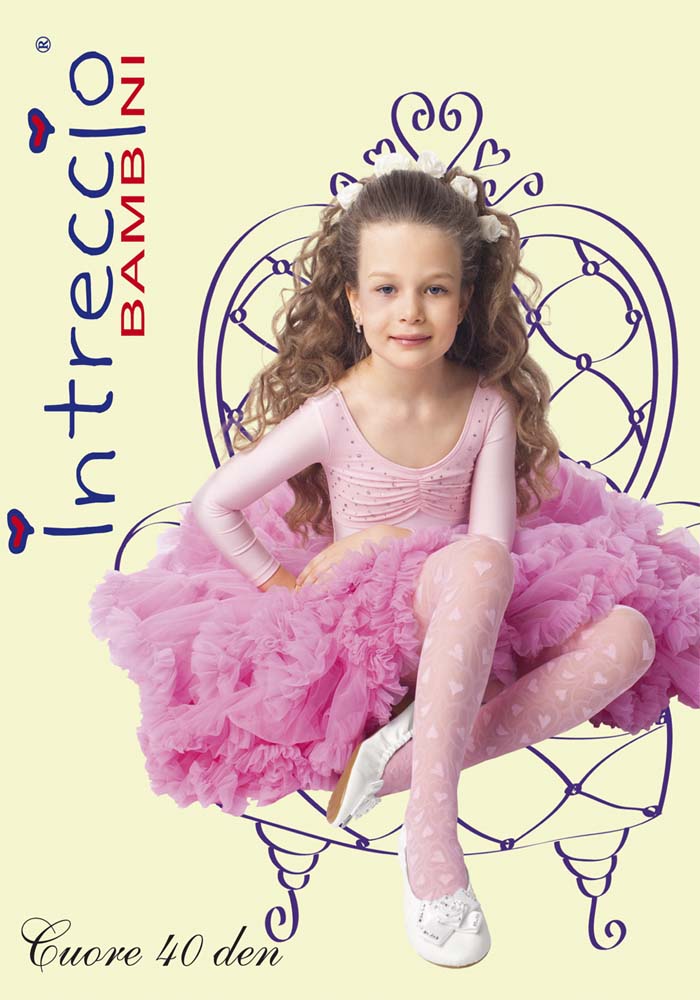 Шелковистые колготки для девочек средней плотности 40 den с тканым узором в виде сочетания больших и маленьких сердечек, плоскими швами, хлопковой ластовицей и укрепленным мыском.