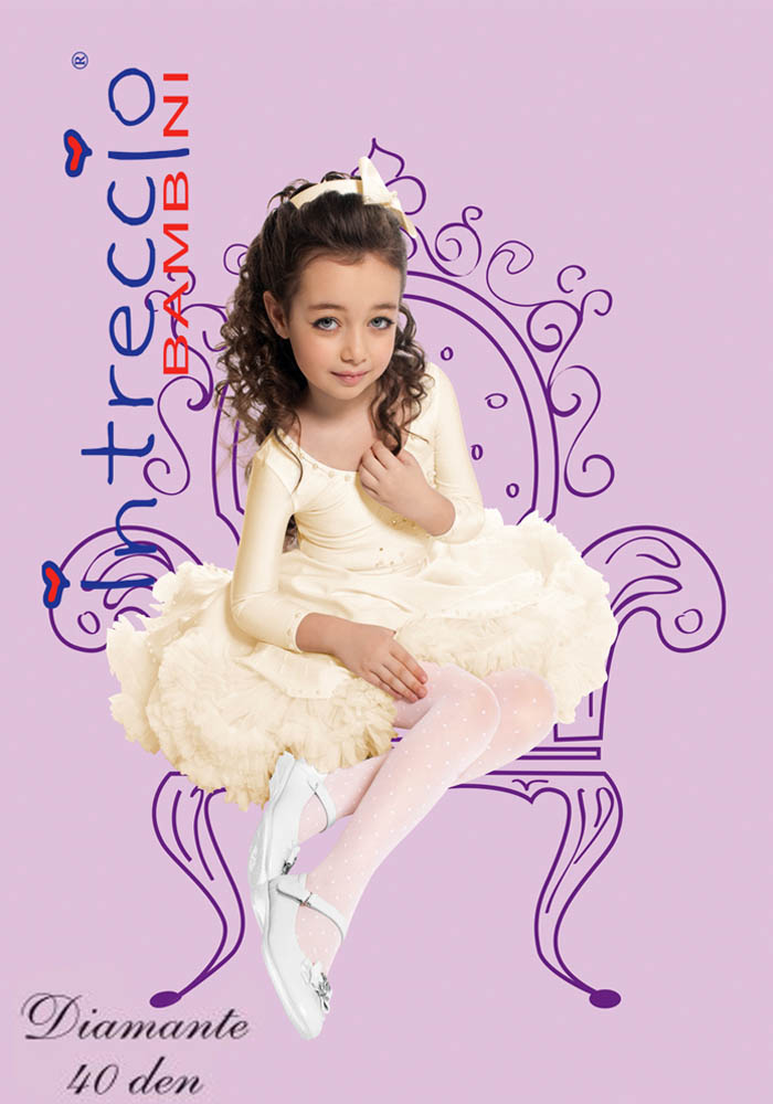 Шелковистые колготки для девочек средней плотности 40 den с тканым рисунком в виде мелкого горошка и имитации ромбовидной сетки, плоскими швами, хлопковой ластовицей и укрепленным мыском.