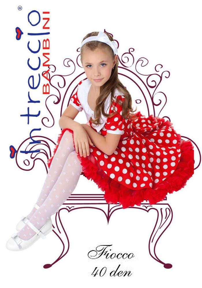 Шелковистые колготки для девочек средней плотности 40 den с тканым рисунком в виде мелких бантиков, плоскими швами, хлопковой ластовицей и укрепленным мыском.