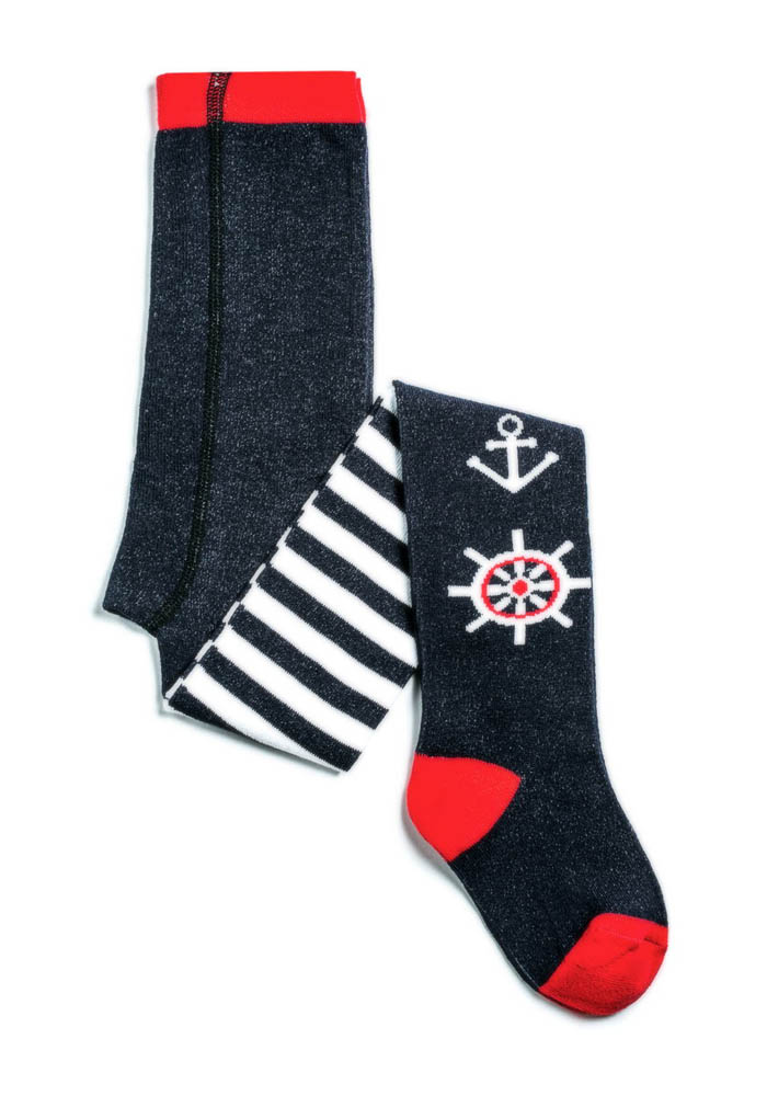 Колготки гладкие демисезонные с морской тематикой поперечно-полосатые по всей длине, на щиколотке рисунок в виде якоря и штурвала, борт, пятка и мысок красного цвета.