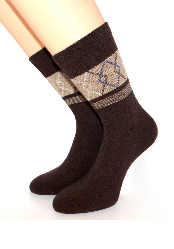 Теплые детские носки из шерсти и ангоры, изнутри махровые, с широкой комфортной резинкой. На боковой части модели размещен контрастный рисунок в виде ромбов.
