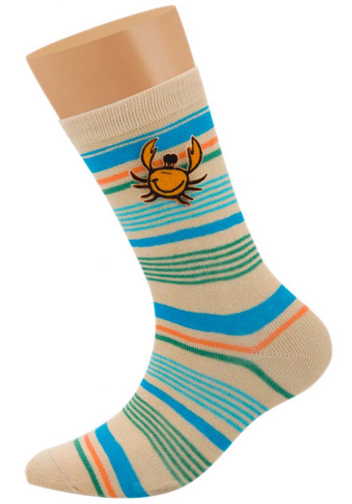 Детские носки из хлопка с эластаном, украшенные разноцветным рисунком "полоски" и боковой нашивкой в виде краба или кита.