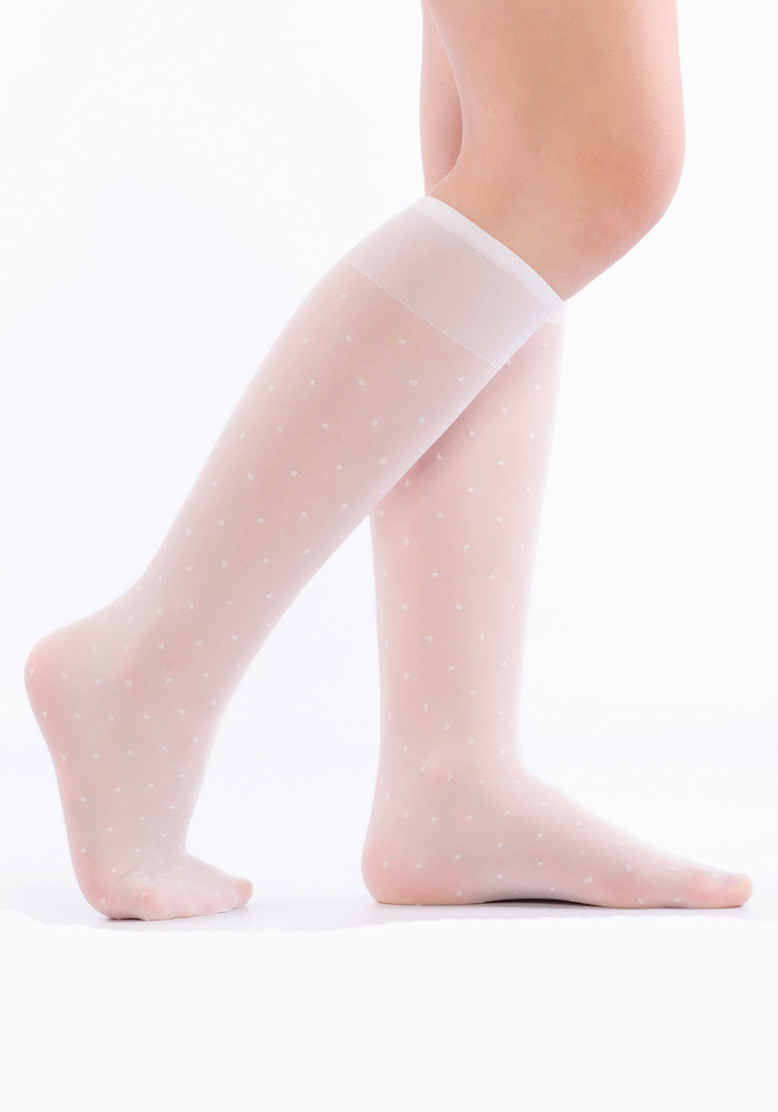 Тонкие детские гольфы с оплетенным эластаном, плотностью 20 ден, с усиленным мыском и комфортной резинкой, по всей длине тканый узор "мелкий горошек".