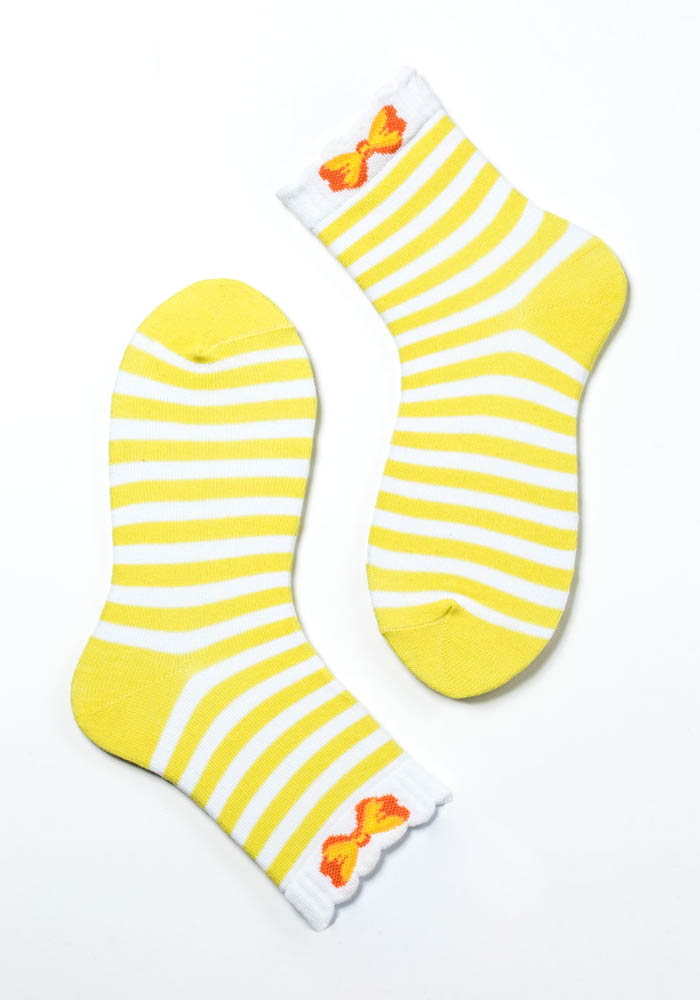 Носки демисезонные для девочки, гладкое переплетение с цветными полосками на белом фоне и рисунком в виде бантика на бортике, паголенок средней длины.
