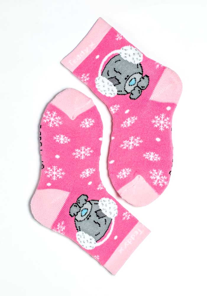 Носки зимние плюшевого переплетения с рисунком знаменитой игрушки "Мишка Тедди" в наушниках со снежинками по всему фону известного бренда "Me to you", борт, пятка и мысок цветные, паголенок средней длины.