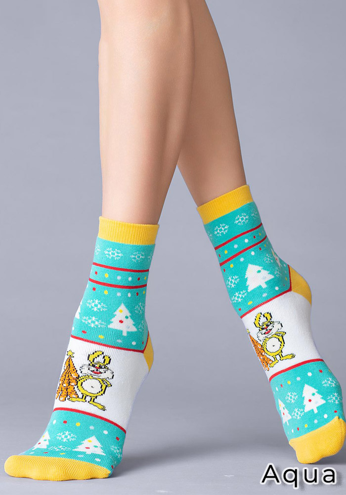 Новогодние женские носки из хлопка с ярким рисунком "зверюшки и елочки" по всей длине. Мягкие, теплые и очень уютные благодаря плюшевой прослойке на внутренней стороне. Широкая удобная резинка комфортно ощущается и обеспечивает оптимальное облегание.