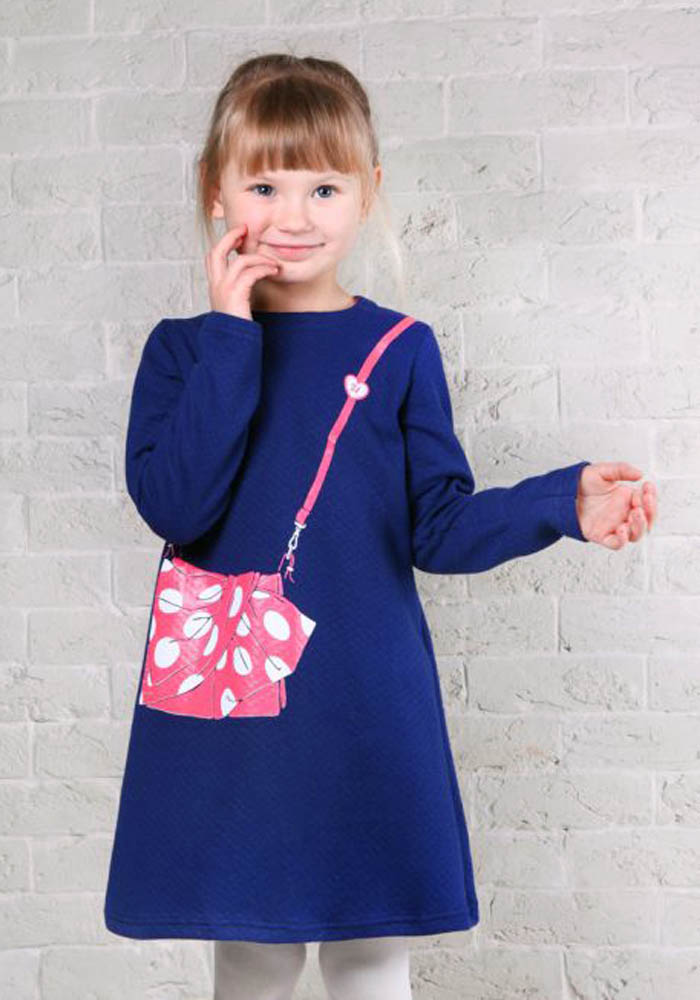 Платье для девочки с длинными рукавами. Украшено спереди аппликацией ввиде сумочки.