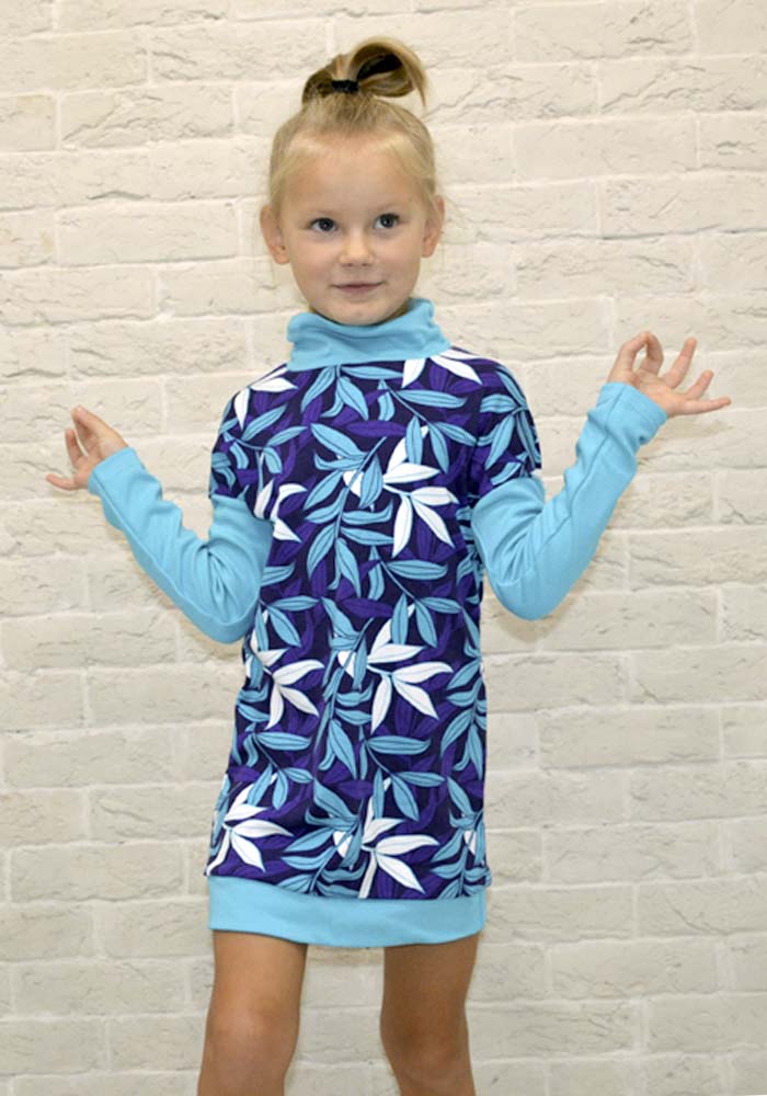Платье для девочки с длинными рукавами в оригинальной цветовой гамме с воротничком-стойкой, прямого покроя.
