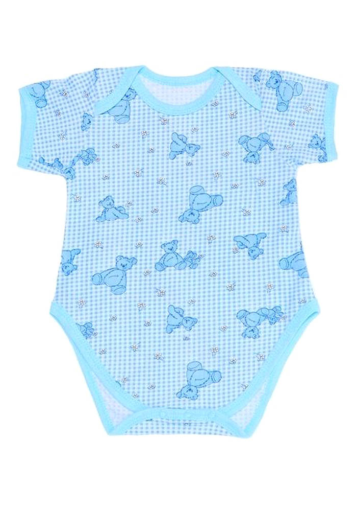 Боди с короткими рукавами на трех кнопочках снизу из натурального хлопка кулирки с яркой детской расцветкой. На плечах разрезики для удобства одевания.
