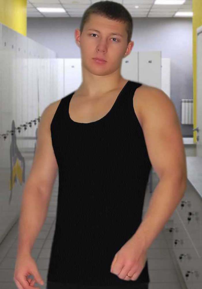 Майка мужская с U-образным вырезом горловины и структурным рисунком в вертикальную полоску.