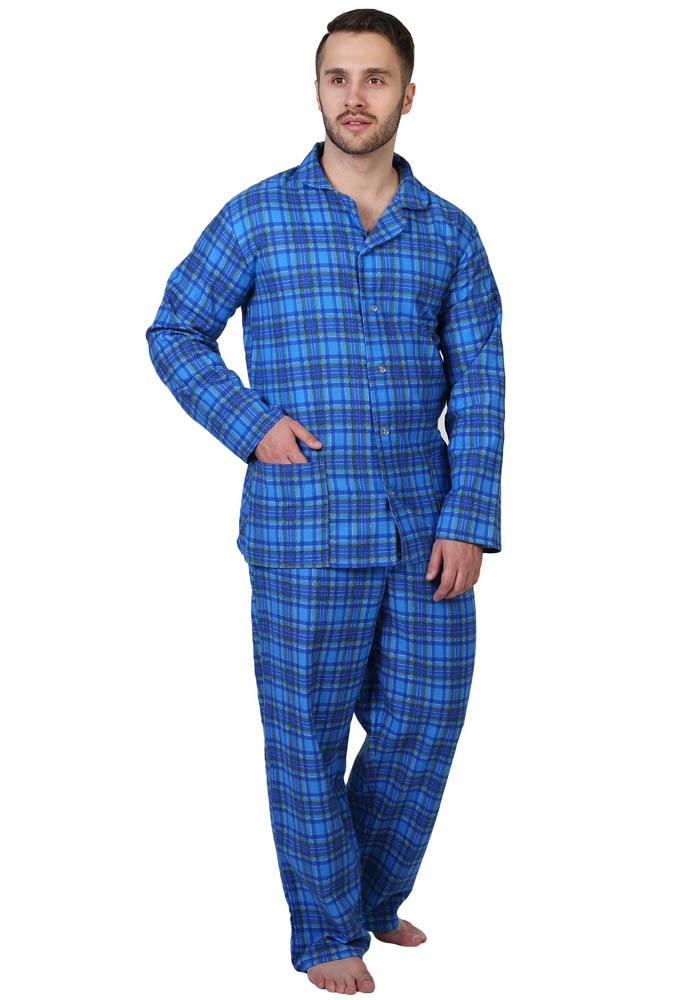 Пижама мужская состоит из пижамной куртки и брюк. Куртка прямого силуэта с застежкой на петли и пуговицы, отложным воротником. Два накладных кармана по низу куртки. Рукав длинный втачной. Брюки прямого силуэта, верх на резинке.