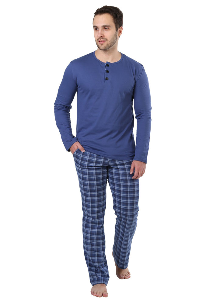 Пижама мужская состоит из футболки и брюк. Футболка прямого силуэта с застёжкой «поло» на петли и пуговицы. Рукава втачные, длинные. Горловина и низ рукава окантованы. Брюки прямого силуэта с цельнокроеным поясом на резинке, с двумя боковыми карманами.