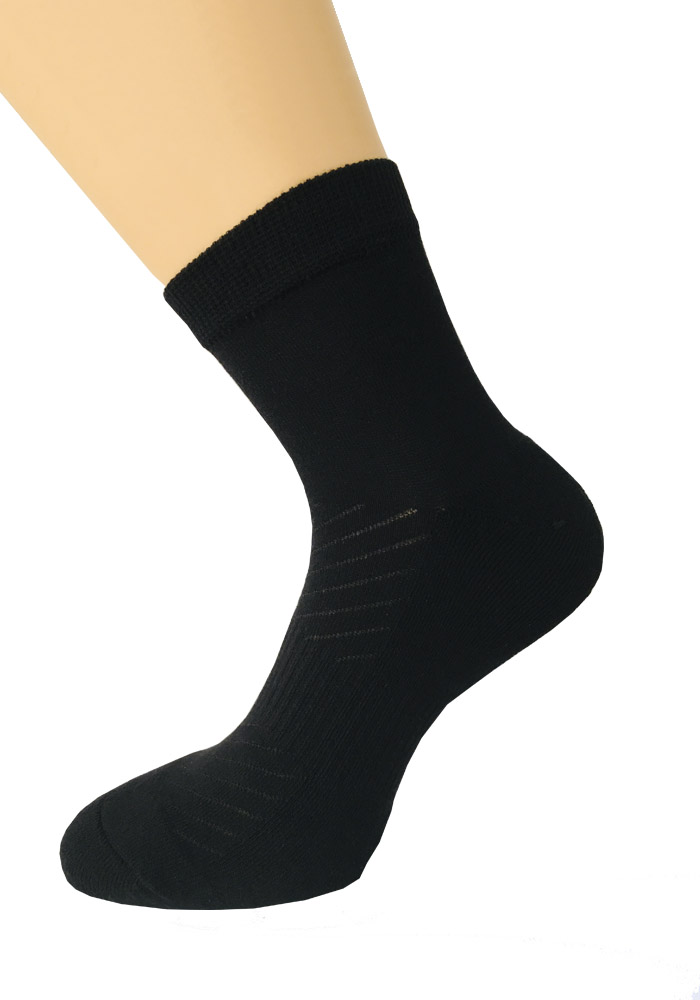 Носки спортивные средней длины, плюшевым следом, широкой резинкой на середине следа изделия (для лучшей фиксации носка) и перфорированным рисунком.
