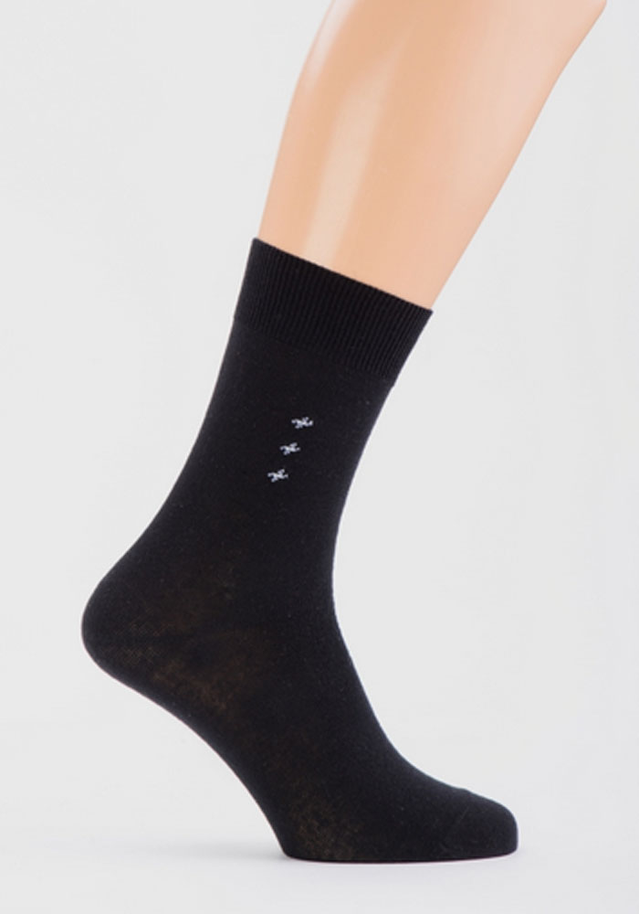 Демисезонный, плотный, гладкий носок с небольшим рисунком на боковой части паголенка.