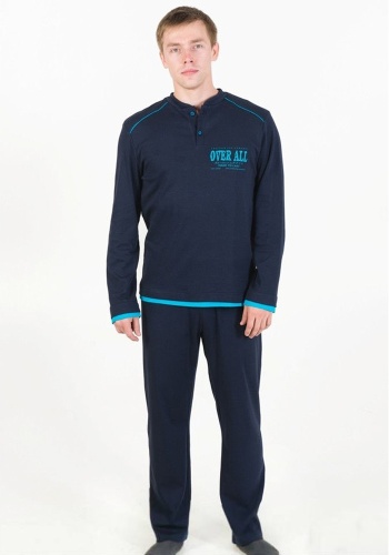 Костюм домашний мужской состоит из футболки с длинными рукавами и брюк. На полочке расположена печать методом шелкографии.