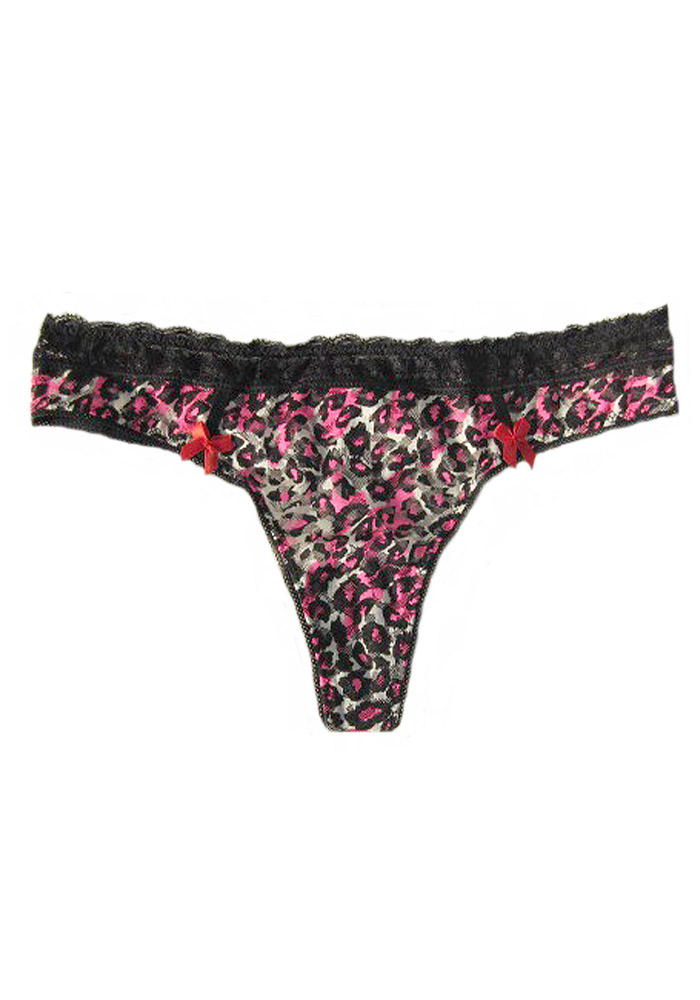 Женские трусики-стринги из набивного полотна, декорированы бантиками и кружевом.