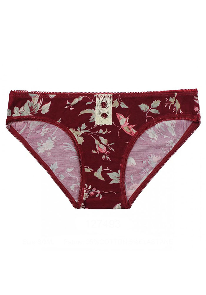 Женские трусики из набивного полотна. Спереди кружевная тесьма и две пуговички.