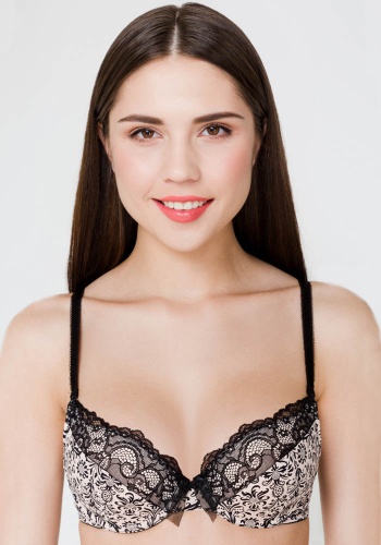 Бюстгальтер классической формы с формованной чашкой с Push-ap для размеров 70AB, 75ABC, 80B и без Push-ap для размеров 70C, 75DE, 80CDE, 85BCD. Детали бюстгальтера выполнены из эластичного принтованного полотна и кружева. Центральная деталь декорирована бантиком. Бретели эластичные, съёмные, декорированы фестонами.