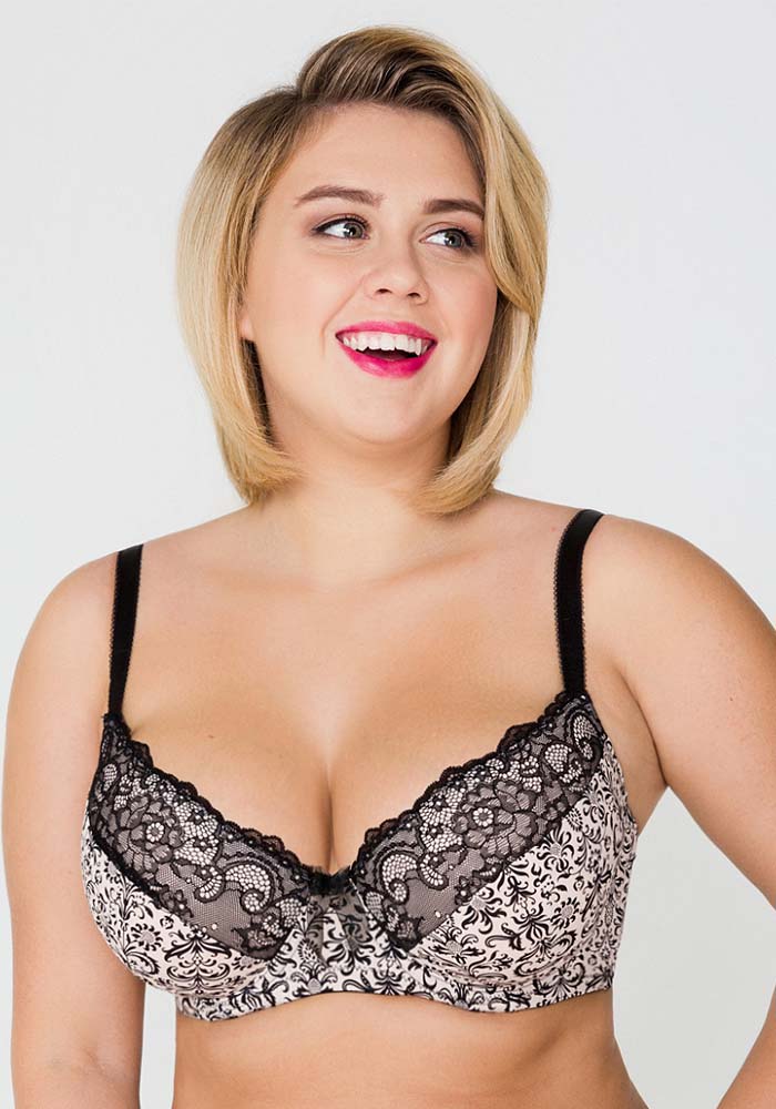 Бюстгальтер формы T-Shirt с формованной чашкой без Push-ap для всех размеров. Детали бюстгальтера выполнены из эластичного принтованного полотна и кружева. Центральная деталь декорирована бантиком. Бретели эластичные, не съёмные, декорированы фестонами.