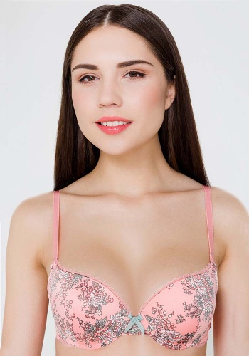 Бюстгальтер классической формы с формованной чашкой с Push-ap для размеров 70AB, 75ABC, 80B и без Push-ap для размеров 70C, 75DE, 80CDE, 85BCD. Детали бюстгальтера выполнены из принтованного атласного полотна и кружева, декорированы эластичной лентой с фестонами. Центральная деталь декорирована бантиком. Бретели эластичные, съёмные.