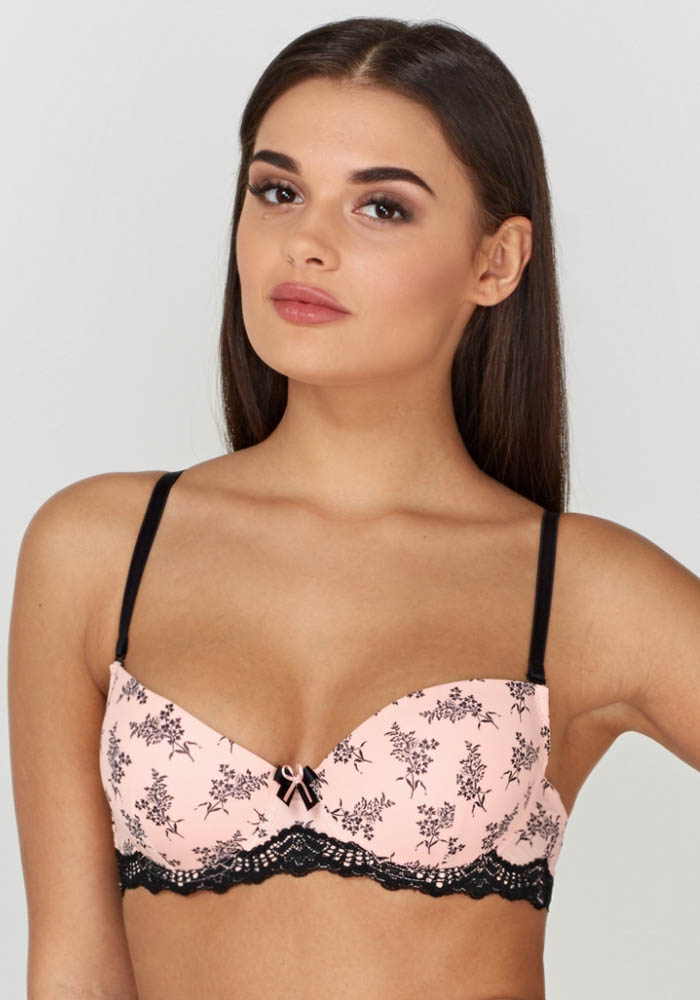 Бюстгальтер формы T-Shirt с формованной чашкой без Push-ap для всех размеров. Детали бюстгальтера выполнены из эластичного принтованного полотна и узкого кружева. Центральная деталь декорирована бантиком. Бретели эластичные, съёмные.