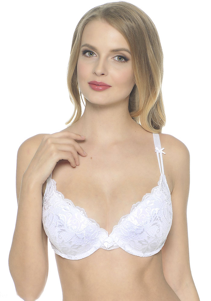 Бюстгальтер классической формы с формованной чашкой с Push-up для размеров 70AB, 75ABC, 80B и без Push-up для размеров 70C, 75DE, 80CDE, 85BCD. Детали бюстгальтера выполнены из эластичной сетки и кружева.