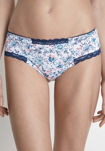 Трусики-боксеры выполнены из эластичного принтованного полотна и узкого кружева. Линия талии декорирована эластичной лентой с фестонами.