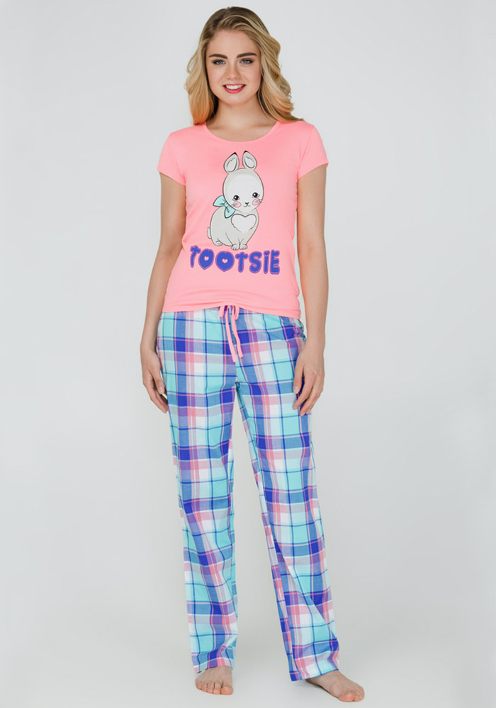 Пижама, состоящая из трикотажной футболки и брюк. Детали футболки выполнены из эластичного полотна неонового цвета с круглым вырезом горловины, декорированная ярким принтом спереди. Детали брюк выполнены из принтованного хлопкового полотна с эластичной резинкой и завязками на поясе.