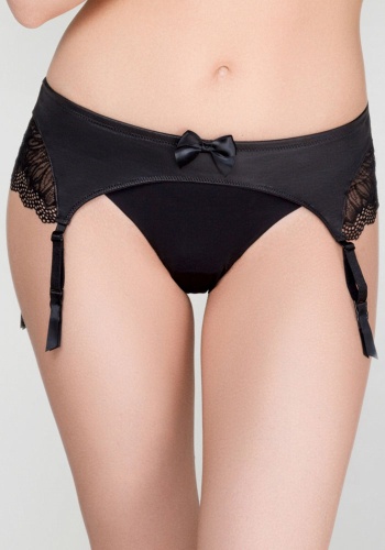 Пояс для чулок из эластичного кружева и эластичной ткани с эффектом "под кожу". Передняя и задняя детали декорированы фигурными вырезами. Передняя деталь декорирована атласным бантиком.