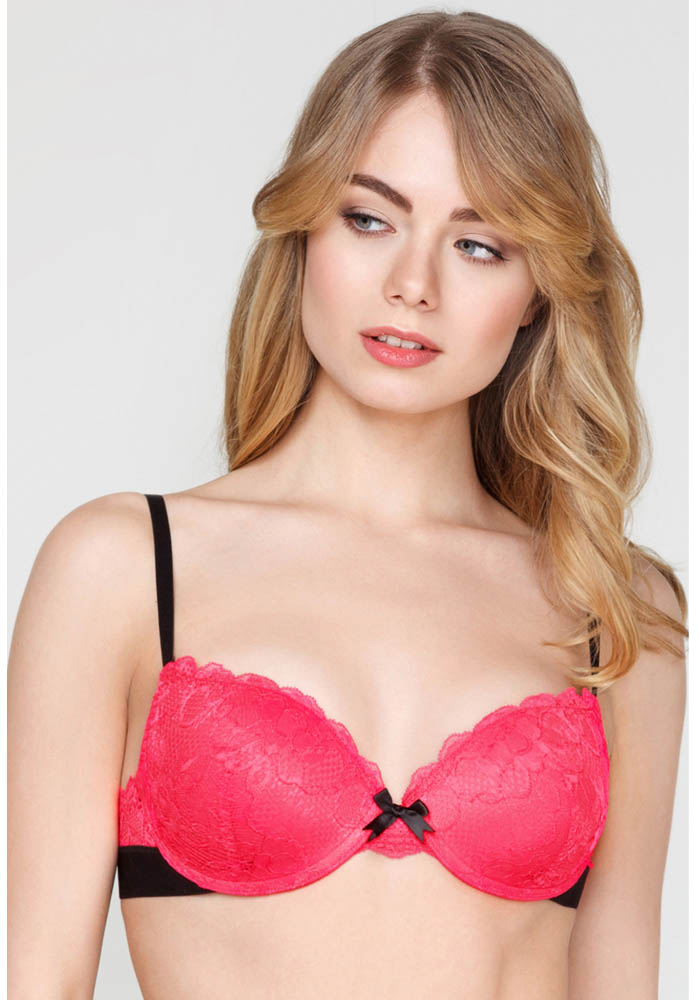 Бюстгальтер классической формы с формованной чашкой с Push-Up для размеров 70AB, 75ABC, 80B и без Push-Up для размеров 70C, 75DE, 80CDE, 85BCD. Детали бюстгальтера выполнены из эластичного кружева неонового цвета, декорированы широкой эластичной лентой. Центральная деталь декорирована атласным бантиком. Бретели эластичные, не съёмные.