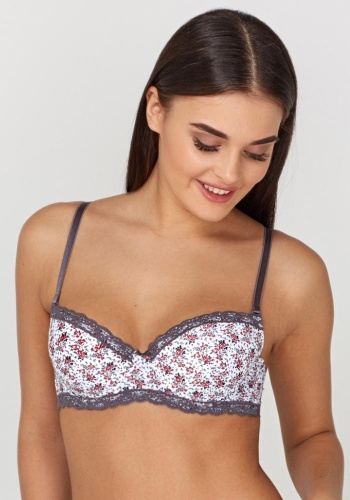 Бюстгальтер формы T-Shirt с формованной чашкой без Push-ap для всех размеров. Детали бюстгальтера выполнены из эластичного принтованного полотна и узкого кружева. Центральная деталь декорирована бантиком. Бретели эластичные, съёмные.