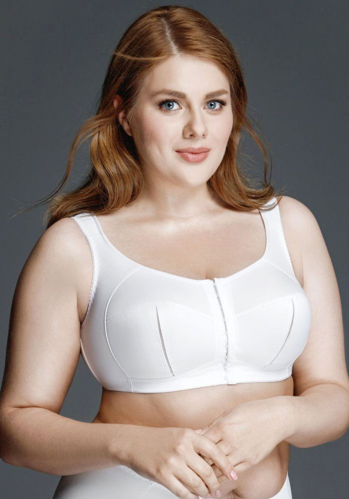 Бюстгальтер из эластичного полотна трикотажного полотна и ламинированного материала, без каркасов. Мягкие чашки с тройным членением. Застёжка спереди. Упругие пластины в боковых деталях стана. Расширенная бретель.