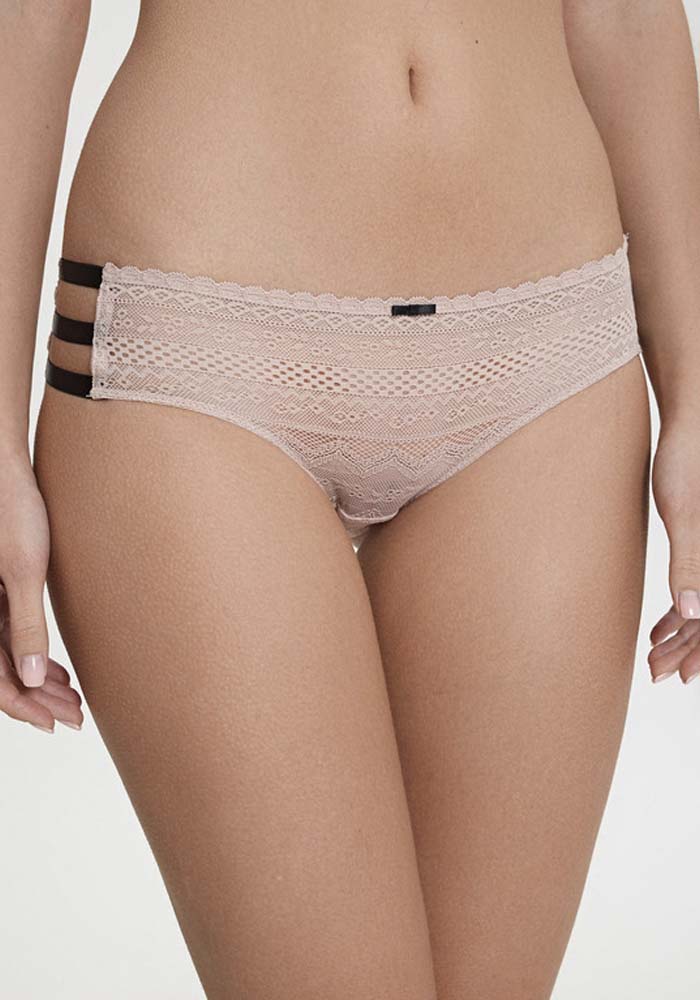 Детали трусов выполнены из кружева. Передняя деталь декорирована бантиком. Боковая часть трусов выполнена тремя эластичными лентами. Внутренняя ластовица из хлопка.