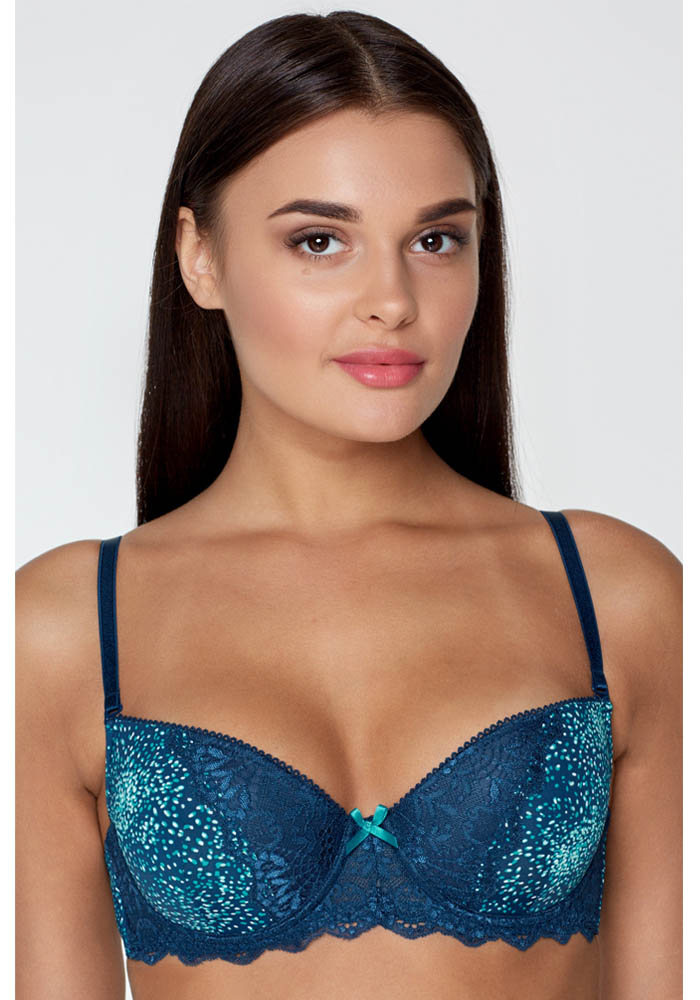 Бюстгальтер формы T-Shirt с формованной чашкой без Push-ap для всех размеров. Детали бюстгальтера выполнены из эластичного принтованного полотна и кружева. Чашки декорированы эластичной лентой с фестонами. Центральная деталь декорирована бантиком. Бретели эластичные, съёмные.