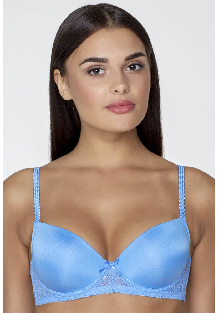 Бюстгальтер формы T-Shirt с формованной чашкой с небольшим мягким Push-ap для всех размеров. Детали бюстгальтера выполнены из эластичного полотна и кружева. Центральная деталь декорирована бантиком с розочкой. Бретели эластичные, не съёмные.
