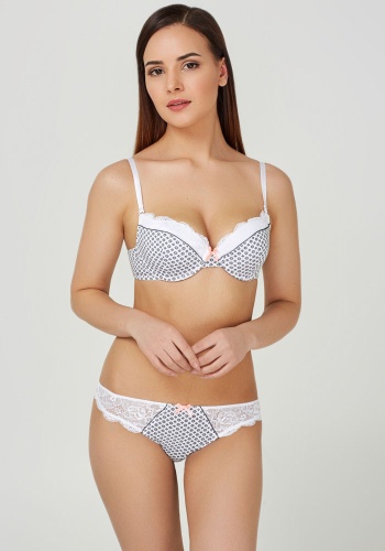Трусики-стринг выполнены из эластичного принтованного хлопкового полотна и кружева. Передняя деталь декорирована бантиком.