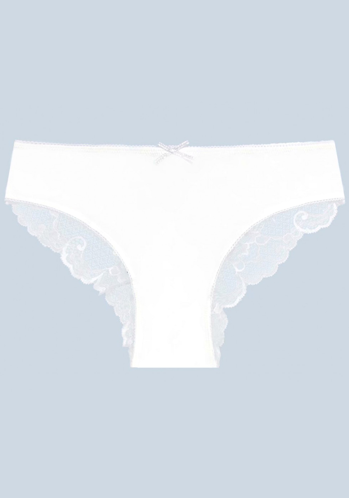 Стильные, красивые, кружевные женские трусы с принтом. Передняя деталь выполнена из однотонной ткани и украшена бантиком. Задняя деталь выполнена из кружева.