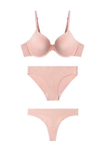 Стильный комплект розового цвета с тонкой поролоновой подкладкой. Комплект состоит из трех предметов бюстгальтера и 2-х трусиков: стринги и слипы. Идеально подходят для ежедневной, повседневной носки, занятий спортом и для особых случаев. Сохраняет форму, цвет и качество ткани после многочисленных стирок.
