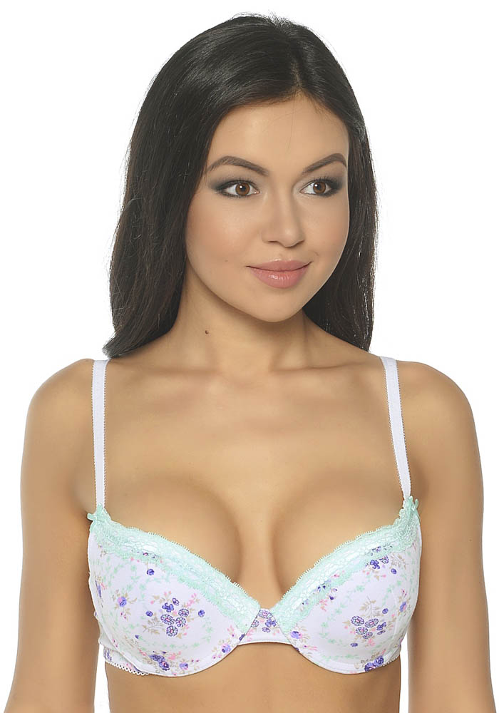 Бюстгальтер классической формы с формованной чашкой с Push-Up для размеров 70AB, 75ABC, 80B и без Push-Up для размеров 70C, 75DE, 80CDE, 85BCD. Детали бюстгальтера выполнены из принтованного эластичного хлопкового полотна, декорированы эластичной лентой с фестонами. Чашки декорированы узким кружевом и бантиками. Бретели эластичные, не съёмные.