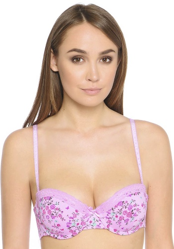 Бюстгальтер формы "балконет" с формованной чашкой, с Push-up для размеров 70AB, 75ABC, 80B и без Push-up для размеров 70C, 75DE, 80CDE, 85BCD. Детали бюстгальтера выполнены из эластичного принтованного полотна, эластичной сетки и узкого кружева. Центральная деталь декорирована бантиком. Бретели эластичные, съёмные, декорированы фестонами.