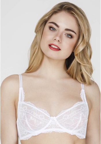 Кружевной бюстгальтер с мягкой чашкой из эластичного полотна и кружева с фестонами. Детали чашки обработаны с двойной деталью из не эластичной сетки. Чашка украшена фигурной деталью из кружева с фестонами. По центру модель декорирована бантиком. Бретели эластичные, не съёмные.