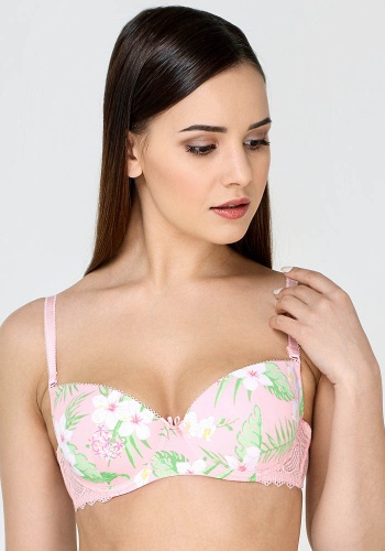 Бюстгальтер формы T-Shirt с формованной чашкой без Push-ap для всех размеров. Детали бюстгальтера выполнены из эластичного принтованного полотна и кружева, декорированы эластичной лентой с фестонами. Центральная деталь декорирована бантиком. Бретели эластичные, съёмные.