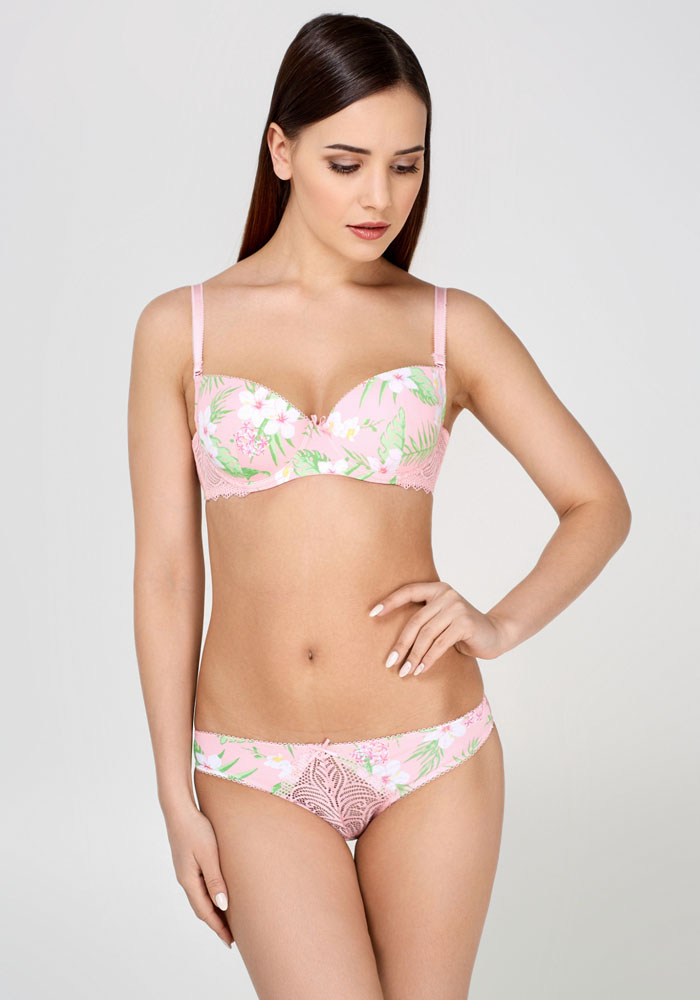 Трусики классические выполнены из эластичного принтованного полотна и кружева, декорированы эластичной лентой с фестонами. Передняя деталь декорирована бантиком.