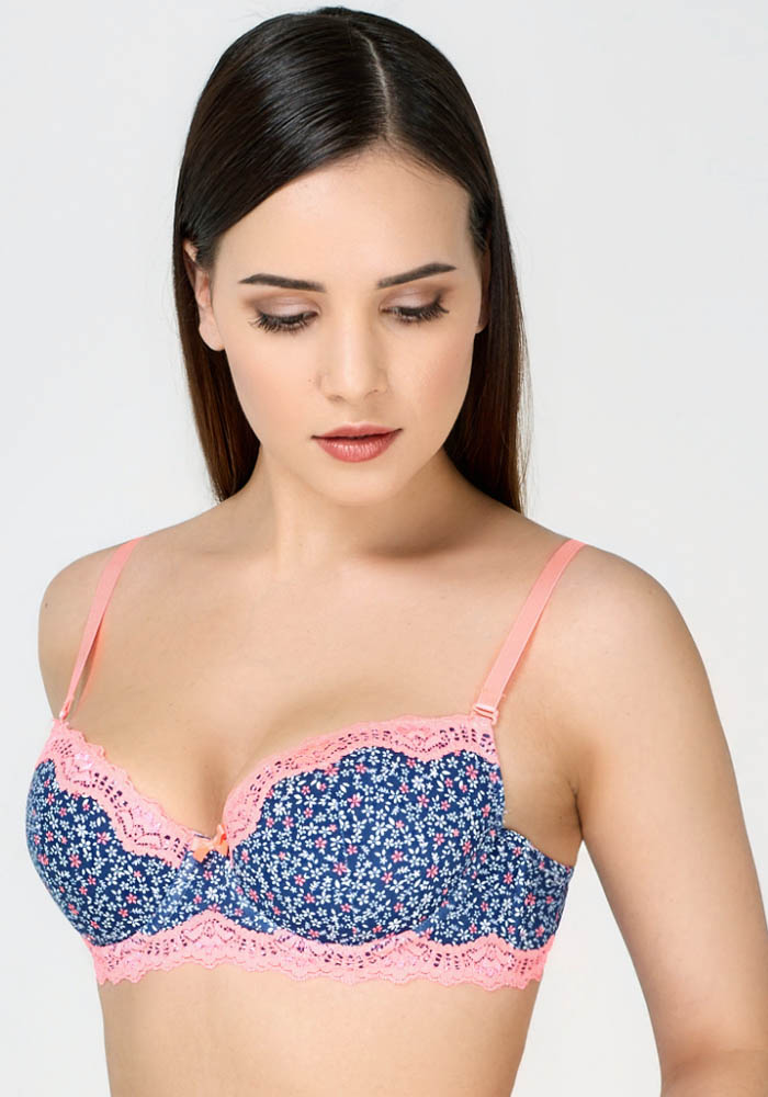 Бюстгальтер формы T-Shirt с формованной чашкой без Push-ap для всех размеров. Детали бюстгальтера выполнены из эластичного принтованного полотна и узкого кружева. Центральная деталь декорирована бантиком. Бретели эластичные, съёмные.